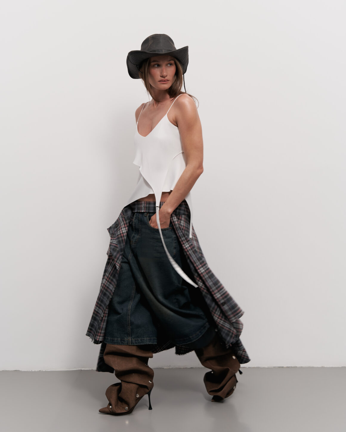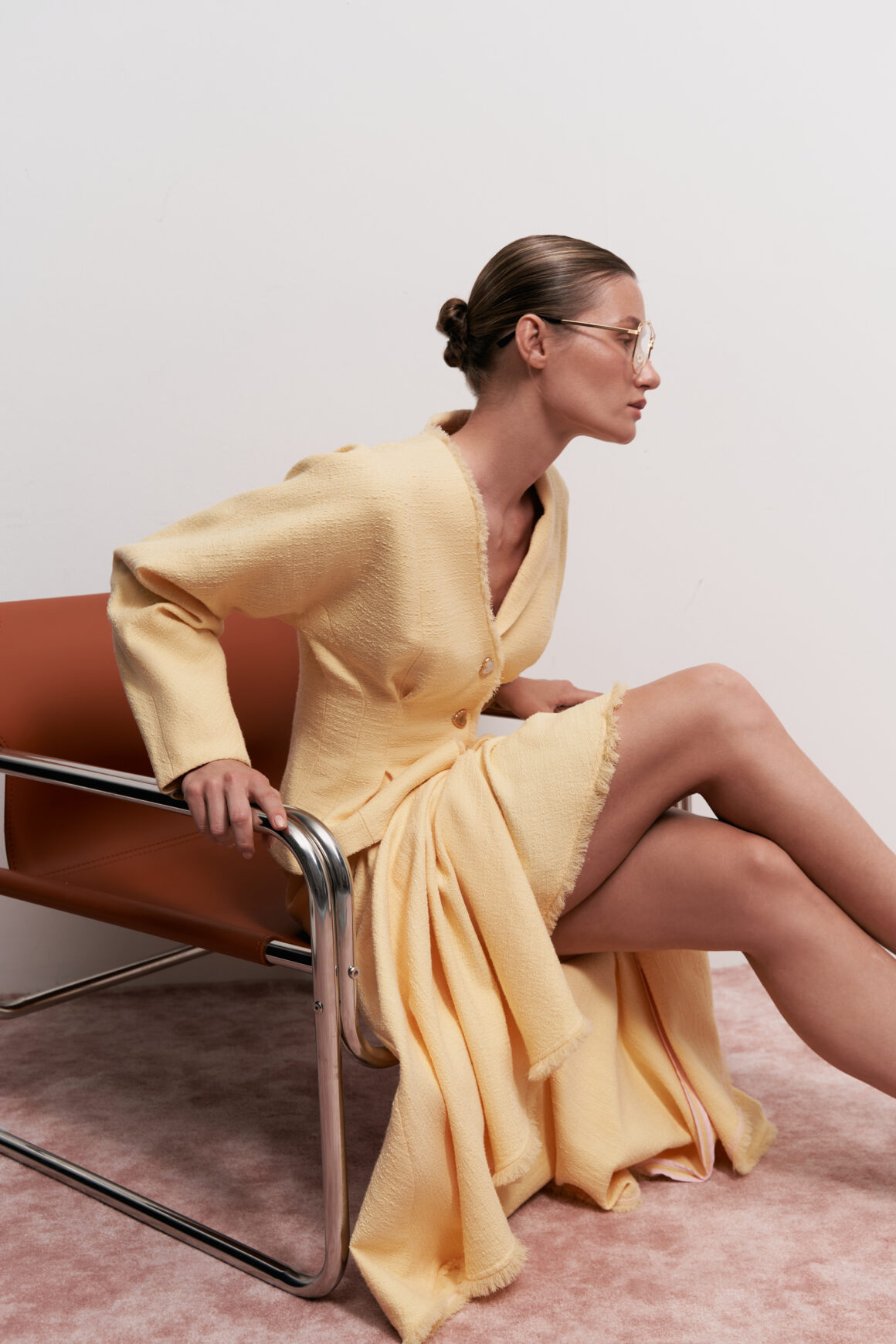 Одежда бренда Lipner отличается своим безупречным качеством. Жакет из твида светло-желтого оттенка с цельнокроеным рукавом, защипами на талии и асимметричным воротником прекрасно гармонирует с юбкой-гаде макси, украшенной оригинальной отрезной кокеткой сверху. Мини-юбка-балон из хлопка в оттенке сливочного масла с регулируемыми кулисками – идеальный вариант для любых случаев. Лонгслив полуприлегающего силуэта с вырезом «лодочкой» в молочном цвете элегантно завершает образ. Рукава с необработанными краями и боковые кулиски придают ему особую выразительность. Юбка-килт в клетку с трансформирующимся поясом и топ на бретелях с многослойным кроем молочного цвета, стилизованным под чулочный пояс, внесут нотку стиля и универсальности в ваш гардероб.
