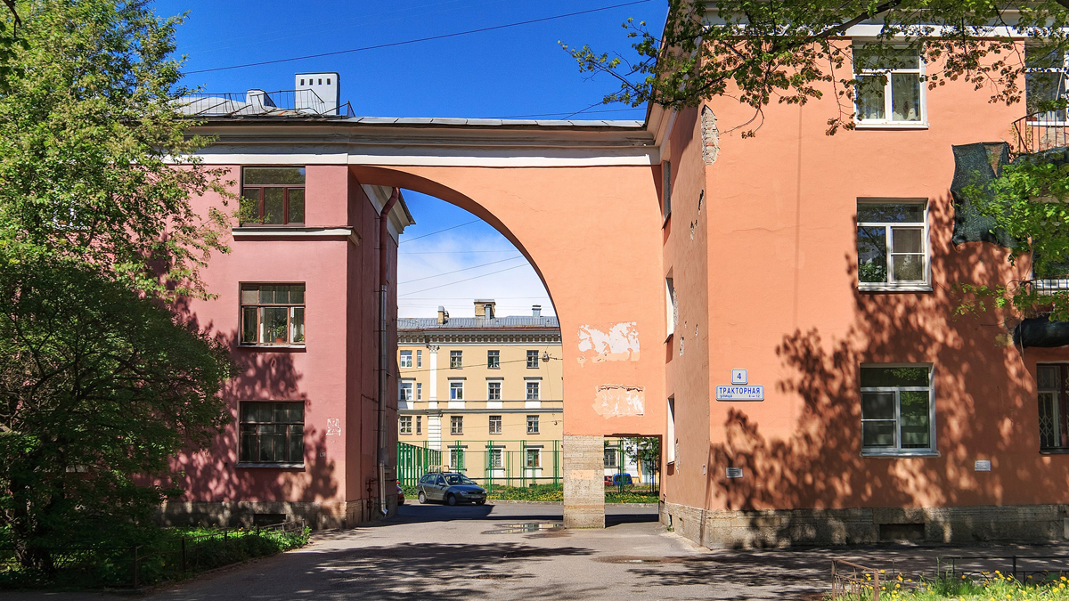 Петербург ассоциируется с разными архитектурными стилями, но в их число точно не входит конструктивизм. А между прочим в Петербурге есть целый район, в котором этот стиль чуть ли не преобладает. Среди главных достопримечательностей — эта улица с не очень заманчивым названием, Тракторная. Ее застройка представляет собой уникальный единый ансамбль жилого массива, построенный в 1925–1927 годах для рабочих Нарвской заставы. Архитекторы тщательно изучали опыт Германии и Швеции. Планировка улицы разительно отличается от привычных для Петербурга дворов-колодцев. Между корпусами есть промежутки, проезд превращен в аллею с небольшой площадью в конце.