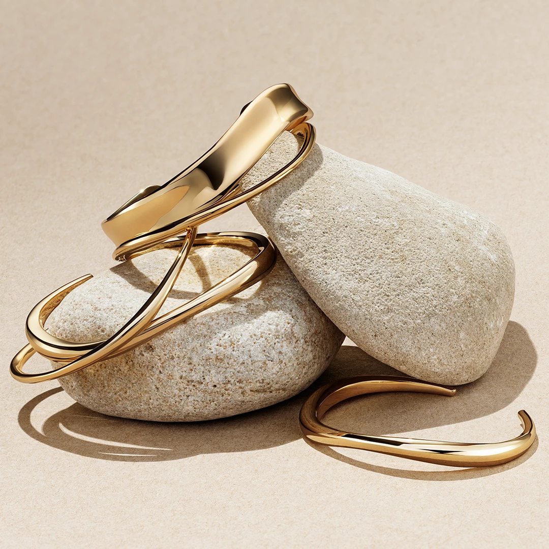 Украшения коллекции PANDORA ESSENCE представлены в двух металлах-Стерлинговом серебре и покрытии 14-каратным золотом. Совершенная простота линий и форм, сияние металлов и жемчужин: дизайн ювелирных изделий будто повторяет неспешное течение воды и нежный узор песка.